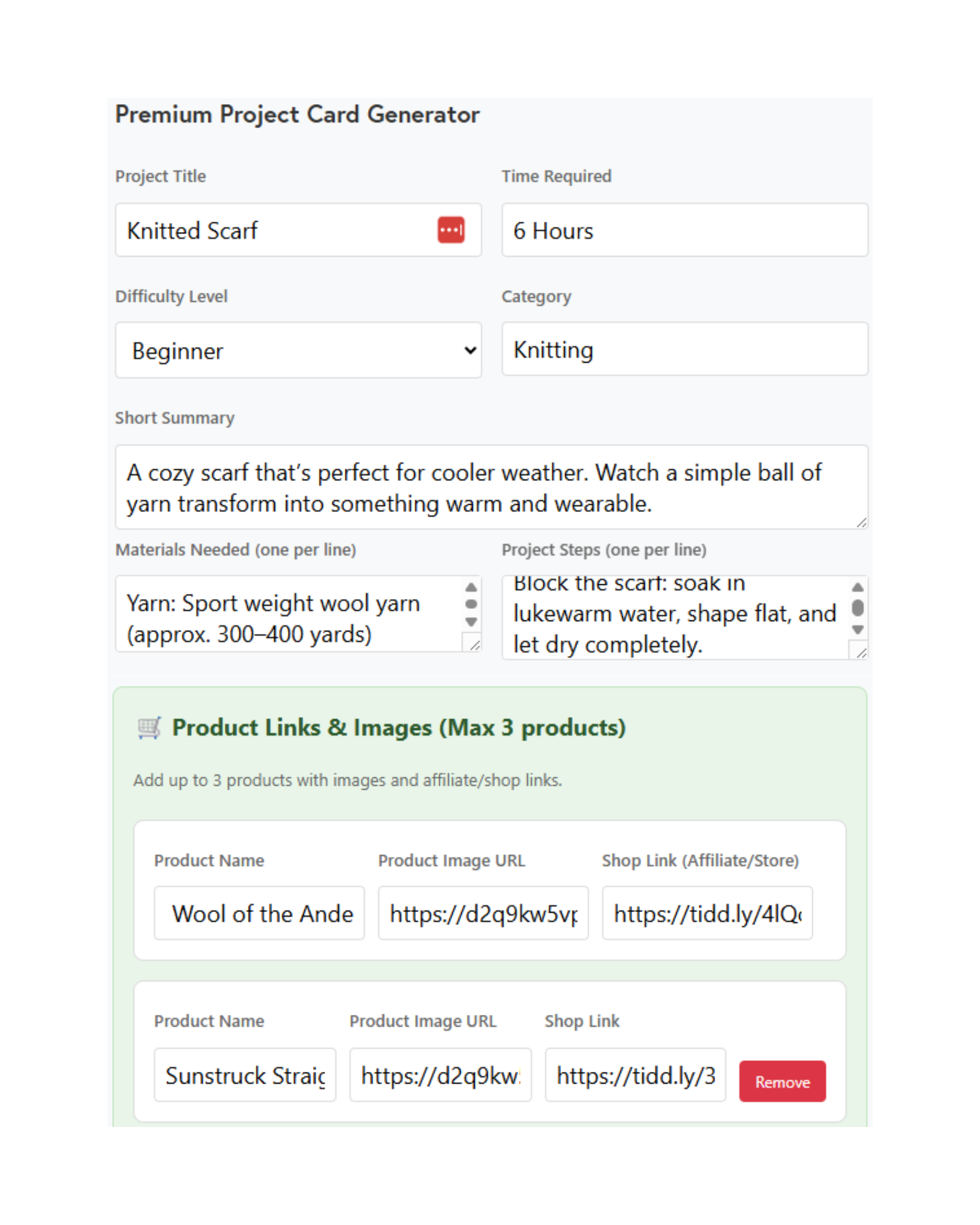 Turn any DIY post into a clean, scannable project card in seconds. Paste your materials and steps, add up to three product tiles with images and shop links, and copy-paste the final HTML into your blog.